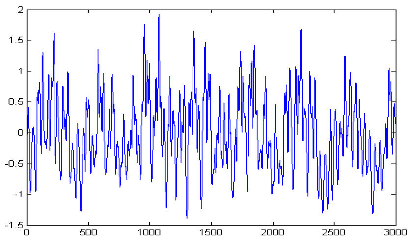 Рисунок 1. График изменения орбитальной климатической диаграммы (ОКД) в интервале времени до 3 млн лет от современности (по оси абсциссы в тыс. лет), полученной суммированием нормированных орбитальных переменных Земли (эксцентриситета, угла наклона и климатической прецессии) в пропорциях