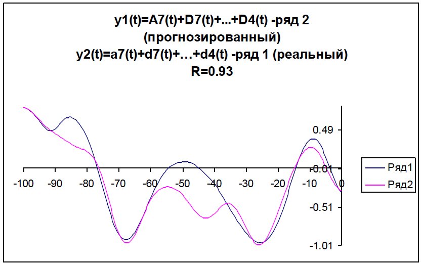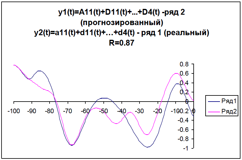 Рисунок 2а. Графики изменений прогнозированной (ряд 2) и реальной (ряд 1) составляющих ОКД в интервале времени тыс. лет к современности, полученных правилом Малла многомасштабного разложения функции