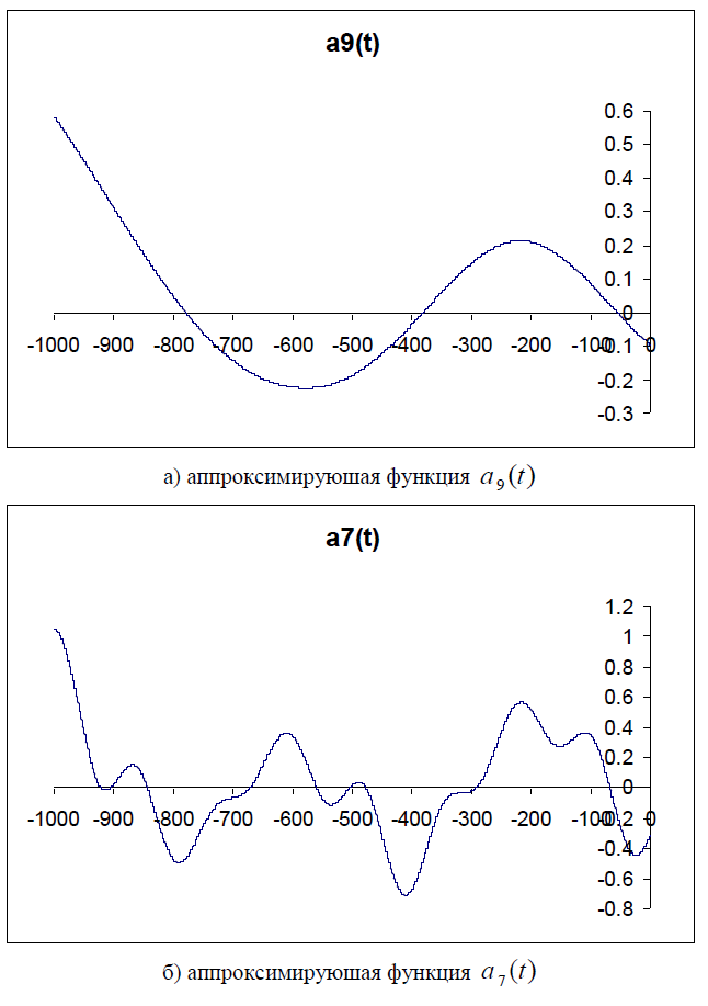 Как видно из графиков рисунка 3, все приведенные выше кривые более простые по сравнению с исходной функцией, представленной на рисунке 1, т. е. содержат меньшее число частот и прогнозируются со среднеквадратической ошибкой .