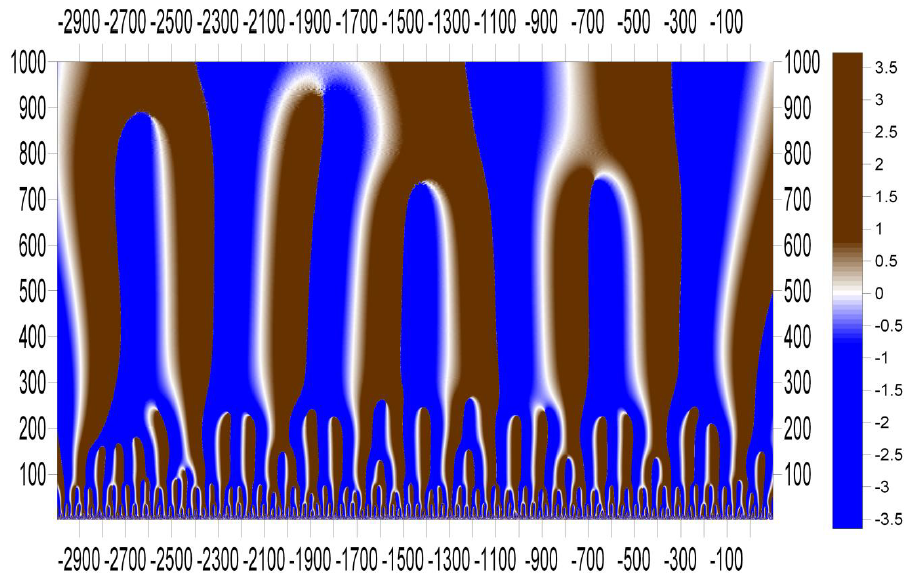 Рисунок 5. Изображение распределения фазы прогнозированной кривой ОКД(t) по масштабам вейвлета в интервале в радианах (по ординате) и времени от 3000 тыс. лет в прошлом до 100 тыс. лет в будущем (по абсциссе)