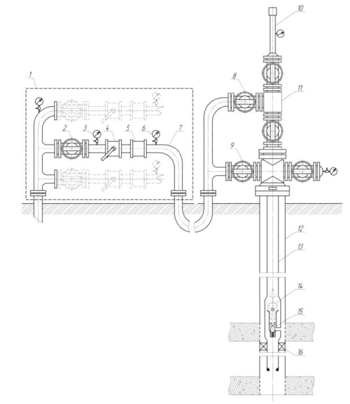 Рис. 2. Однотрубная однопакерная компоновка для одновременно-раздельной закачки воды в два пропластка: 1 – водораспределительная гребенка; 2 – задвижка входная; 3, 6 – манометр; 4 – регулятор расхода; 5 – расходомер; 7 –водовод нагнетательный; 8 – задвижка нагнетательного водовода; 9 – задвижка затрубья; 10 – лубрикатор; 11 – устьевая арматура; 12 – эксплуатационная колонна; 13 – колонна НКТ; 14 – дроссель верхнего пласта; 15 – КОРЗ-2; 16 – пакер самоопрессовочный
