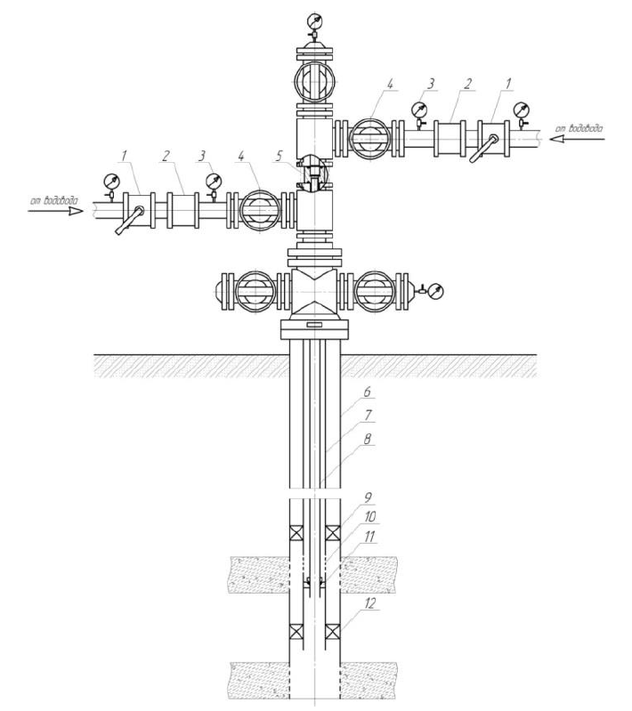 Рис. 3. Двухтрубная компоновка для ОРЗ воды в два пропластка:1 – регулятор расхода; 2 – расходомер; 3 – манометр; 4 – задвижка; 5 – планшайба подвески внутренней колонны труб; 6 – эксплуатационная колонна; 7 – внешняя колонна труб; 8 – внутренняя колонна труб; 9 – верхний пакер; 10 – фильтр; 11 – разъединитель; 12 – пакер самоопрессовочный