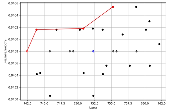 Точки, входящие во множество Парето, выделены красным цветом и соединены ломаной линией. Исходный комплект приборов охраны изображен синей точкой.
