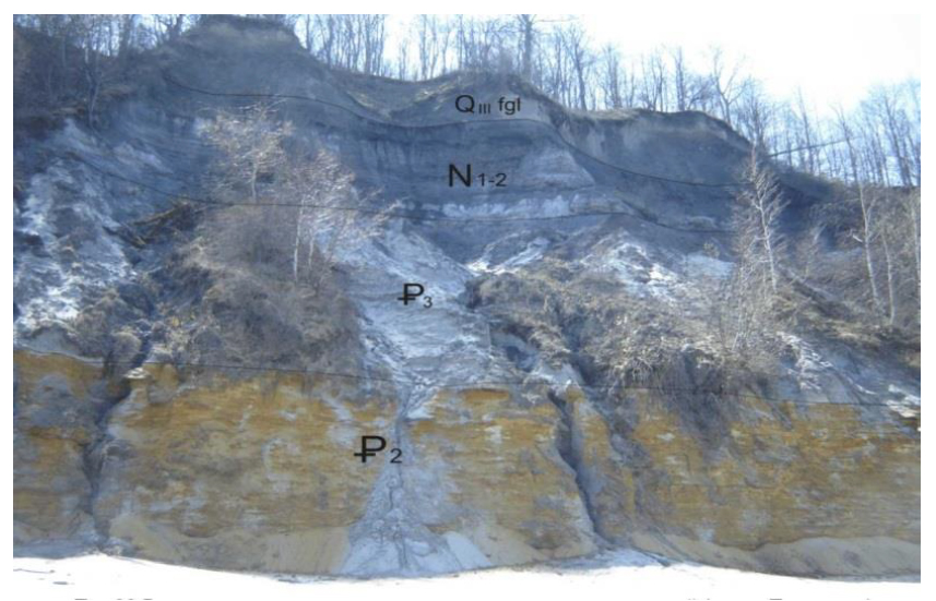 Литологический состав палеоген-неогеновых пород представлен в основном слабосцементированными песчано-алевритово-глинистыми отложениями, легко поддающийся размыву морскими волнами, поверхностными и подземными водами, а также атмосферными осадками (рисунок 2). Залегание коренных пород (неоген-палеогеновых) – субгоризонтальное (рисунок 1), но на многих участках они подвержены ледниковой экзарации и деформациям. Общая видимая мощность коренных пород до 40–50 м.