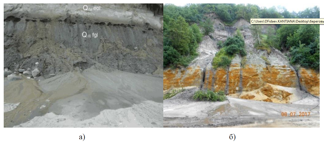 Рисунок 2 – Денудация склонов подземными и поверхностными водами: а – район пос. Куликово; б – район пос. Приморье
