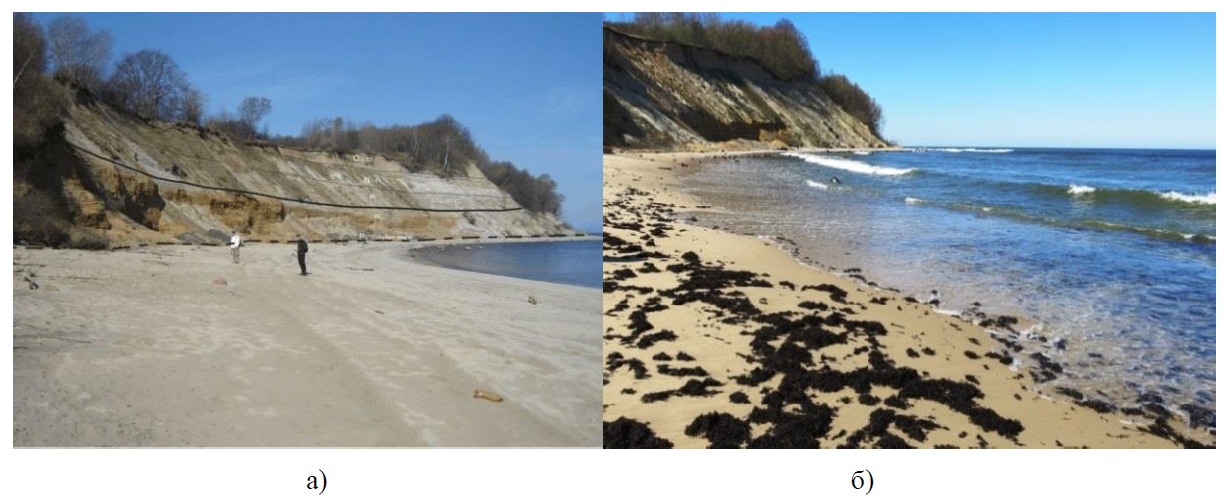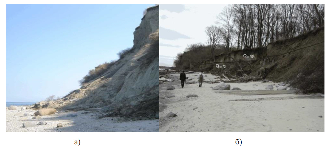 Четвертичные отложения Самбийского полуострова представлены ледниковыми (валунно-галечными супесями и суглинками) и водно-ледниковыми отложениями (суглинки с горизонтами и линзами песчано-гравийных и галечных отложений). Мощность четвертичных отложений прибрежных склонов меняется от первых метров до первых десятков метров. Характерной особенностью четвертичных отложений прибрежий является плотное их сложение, с включениями валунов и галек. В процессе размыва берега глинисто-алевритовая и частично песчаная фракция морен выносятся в море, оставшиеся валуны, гальки и гравийные фракции образуют у основания склонов и на пляже естественные каменные завалы, защищающие берег от активной абразии (рисунок 3).
