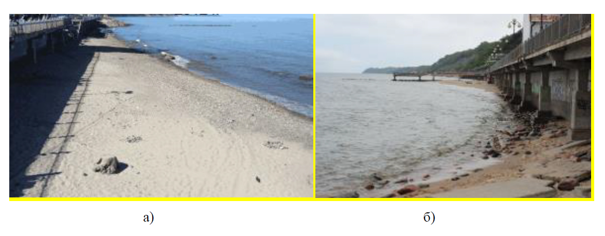 Рисунок 7 – Фрагменты фотографий с изменениями береговой зоны в районе Светлогорска в летний период 2012 (а) и 2017 (б) годов