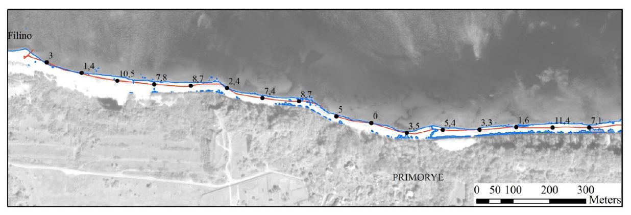 В исследованиях динамики береговой зоны на космических снимках предварительно был проведен анализ точности измерений береговой линии на снимке Ресурс-П № 2 путем сравнения с данными наземных измерений координат береговой линии. Наземный обход был произведен в июне 2017 года по внешней границе берега с использованием портативного GNSS-приемника (GPS и GLONASS) в районе населенных пунктов от Филино до Лесного. Длина пройденного вдоль берега участка составляет около 2,7 км. Пример полученного в результате наземного обхода внешней границы берега приведен на рисунке 8 красным цветом, где он дается в сравнении с береговой линией, полученной по снимку Ресурс-П № 2 (синий цвет). Точками показаны значения расстояния между береговыми линиями с шагом 100 м.
