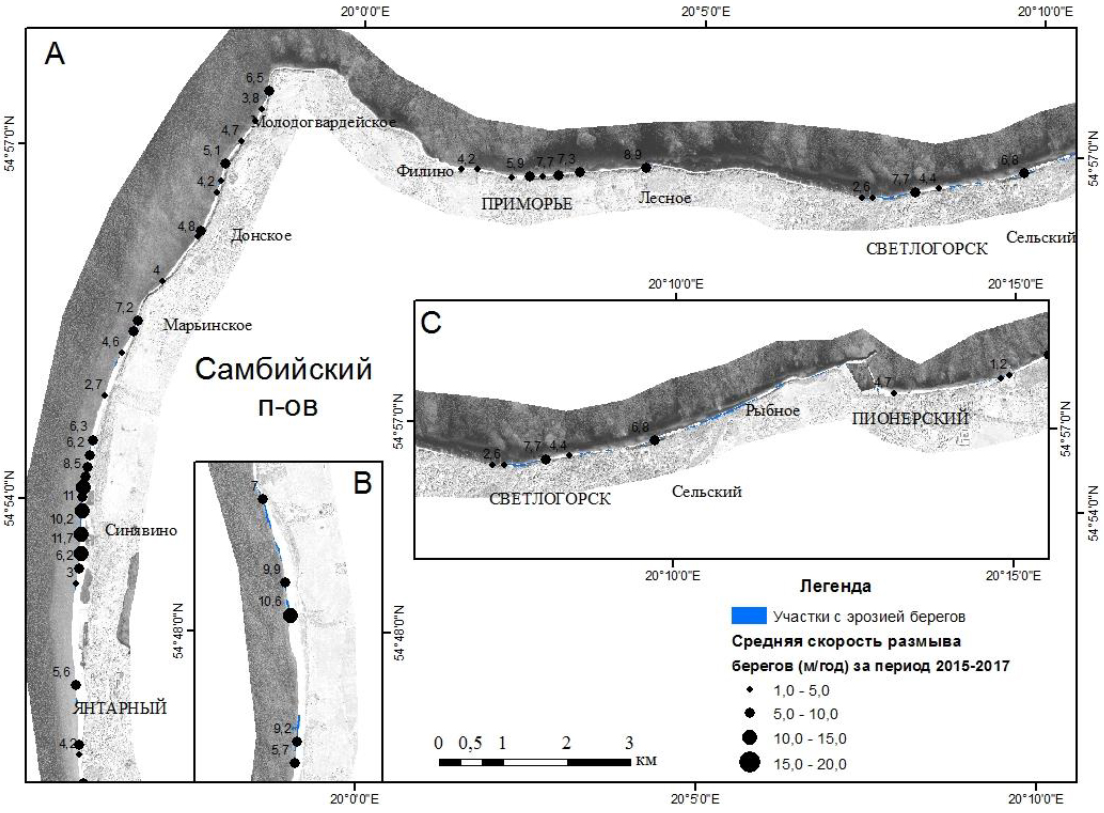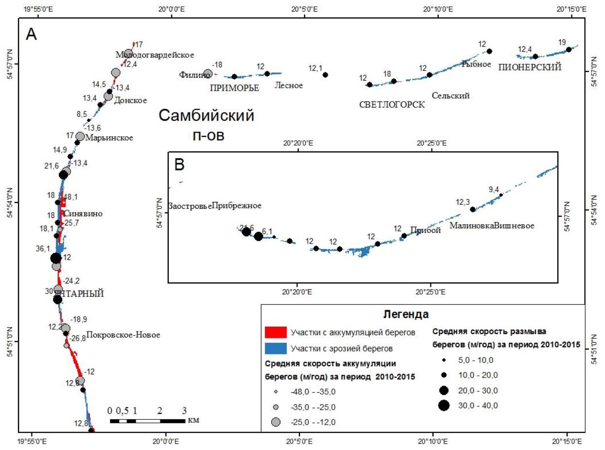 По результатам измерения участков размыва среднее суммарное смещение береговой линии в сторону берега от Балтийска до Прибрежного за 2 года составило 7 м, что сопоставимо с величиной погрешности измерений, связанной с локальным изменением положения береговой линии. Однако на рисунке 10(B) южнее поселка Покровское-Новое можно отметить некоторое увеличение величины размыва от 12 до 18,5 м/год. Данная величина выходит за пределы возможной погрешности измерений, поэтому можно говорить о реальном наличии участков с эрозией берегов. Данная тенденция прослеживается в районе Светлогорска, с размывами участков около 8 м за два года (рисунок 10(С), что также подтверждается фотоиллюстрациями на рисунке 7(а) и 7(б) за сравниваемые годы 2012 и 2017, по которым можно наблюдать сокращение пляжных территорий после сильнейшего шторма в 2012 году. Прикорневую часть Самбийского полуострова можно назвать относительно стабильной, здесь участки размыва находятся в пределах погрешности измерений, связанной с локальной короткопериодной динамикой волн «размыва-намыва». Общая площадь участков размыва береговой зоны Самбийского полуострова за период исследования 2015–2017 гг. составила 21,3 га.