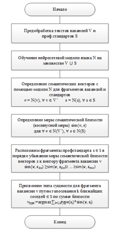 На рисунке 2 представлена общая схема алгоритма определения типа сущности на основе определения ближайших по семантике элементов текстов стандартов для каждого из элементов вакансии. При этом семантическая близость текстов в данном случае определяется на основании близости векторных представлений текстов, сгенерированных нейросетевой моделью языка, обученной на большом корпусе текстов вакансий и профстандартов.