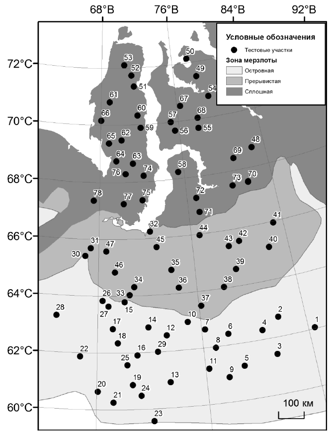 Выбор тестовых участков осуществлялся на основе общепринятого в подобных исследованиях подхода, в местах концентрации термокарстовых озер, т. е. в местах, где возникают условия для развития и формирования очагов термокарста [22]. На каждом тестовом участке (ТУ) по космоснимкам дешифрировалось от нескольких сотен до нескольких тысяч термокарстовых озер. Общая характеристика тестовых участков и их распределение по зонам мерзлоты даны в таблице 1.