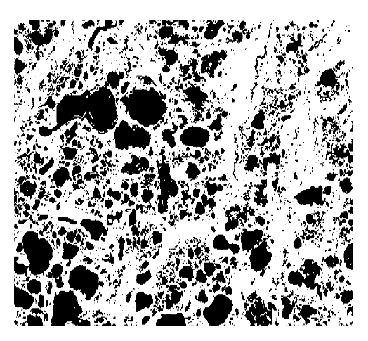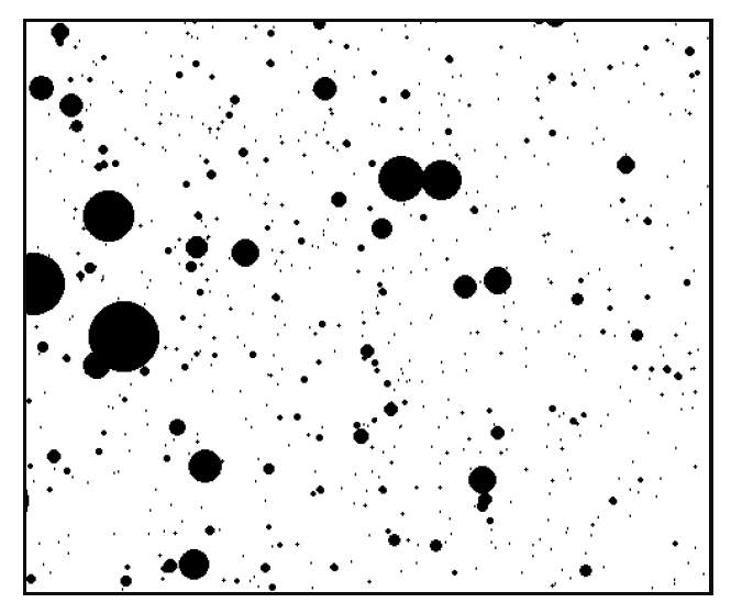 Результатом работы модели является смоделированное поле модельных озер, значения площадей которых распределены по логнормальному закону. Для иллюстрации на Рисунке 6 приведен результат моделирования в виде фрагмента смоделированного изображения поля термокарстовых озер. При моделировании этого фрагмента были заданы число модельных озер 3000 и параметры логнормального распределения и определенные выше по экспериментальным данным для зоны мерзлоты Западной Сибири.