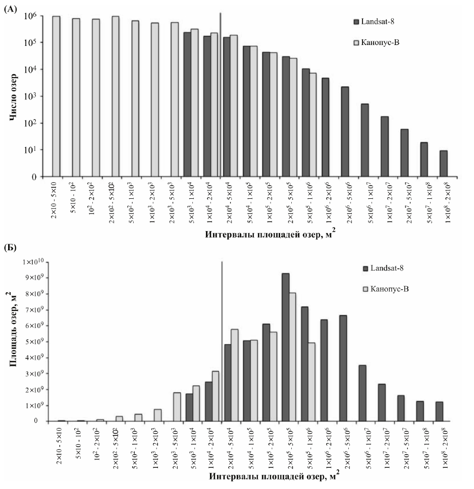 Рисунок 3 – Гистограммы распределения числа озер (А) и их общих площадей (B) по размерам с перекрытием в интервале от 5 × 103 до 106 м², полученных по снимкам среднего разрешения (Landsat-8, черные столбцы) и высокого разрешения (Канопус-В, белые столбцы). Отрезки вертикальных линий на графиках отмечают точку «сшивания» двух частных гистограмм, полученных по снимкам высокого либо среднего разрешения