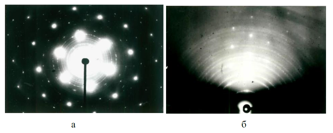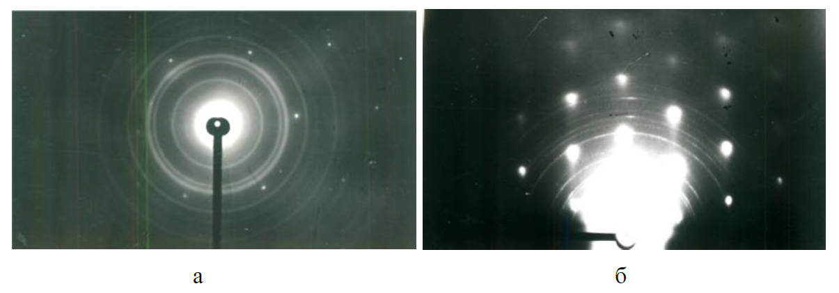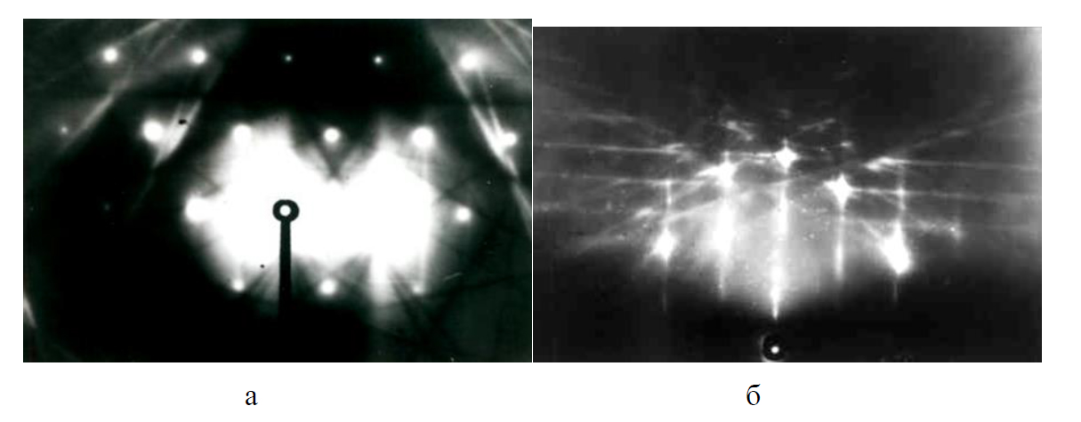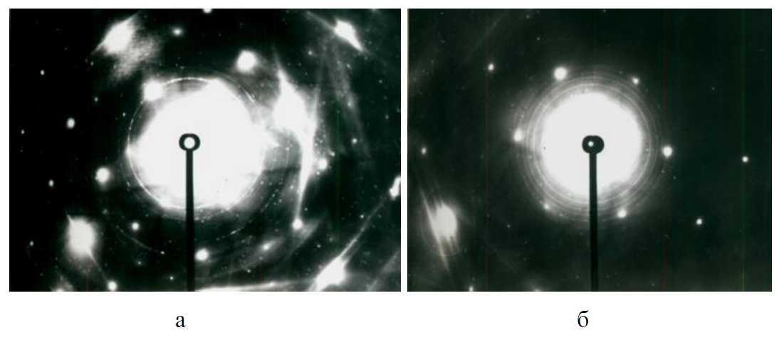 Поверхность исходных пластин кремния со средней плотностью дефектов упаковки 4,2∙106 м-2 и дислокаций 5,1∙106 м-2 обладает достаточно высоким совершенством структуры, о чем свидетельствуют электронограммы, полученные методами на просвет (рисунок 1а) и на отражение (рисунок 1б). На них присутствуют точечные рефлексы, принадлежащие монокремнию и Кикучи-линии, образующиеся за счет динамического рассеяния электронов на более глубоких слоях, имеющих высокое совершенство структуры кристаллической решетки.