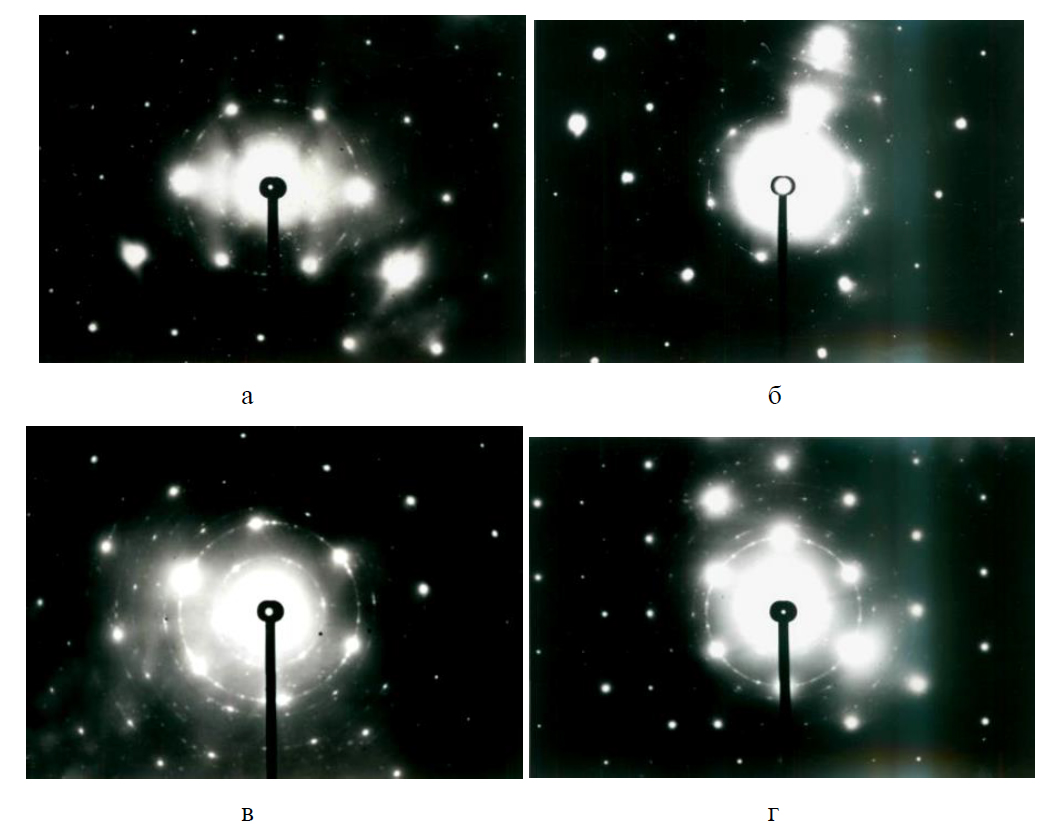 Рисунок 7 – Электронограммы переходного слоя системы Mo – Si, легированной ионами Р+ после отжига: а– доза легирования 4,375×1015см-2, отжиг при 600 °С в вакууме в течение 720 с;