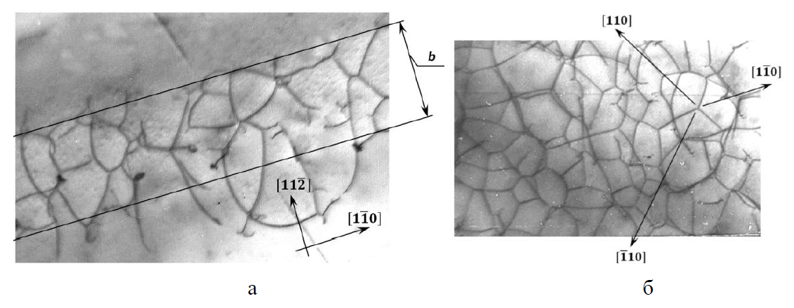 Рисунок 4 – Дислокационная структура в активной области Si(111): а– доза имплантации ионов Р+ 6,25∙1014см-2, активационный отжиг при 1150 °С; б – доза имплантации ионов Р+ 6,25∙1014см-2, доза легирования 3,125∙1015 см-2системы Mo – Si, отжиг при 500 °С