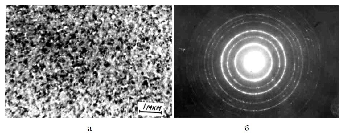 Рисунок 5 – Структура (а) и микроэлектронограмма (б) пленки Мо до термообработки