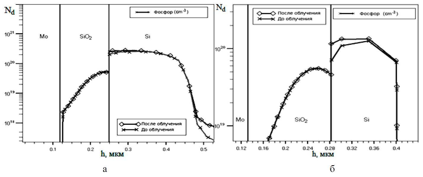 Рисунок 10 – Распределение фосфора по глубине h транзисторной структуры прибора КТ916А до и после облучения ионами фосфора омических контактов Mo – n+Si с энергией 100 кэВ и дозой 6×1014 см-2для стандартной (а) и предложенной (б) технологии