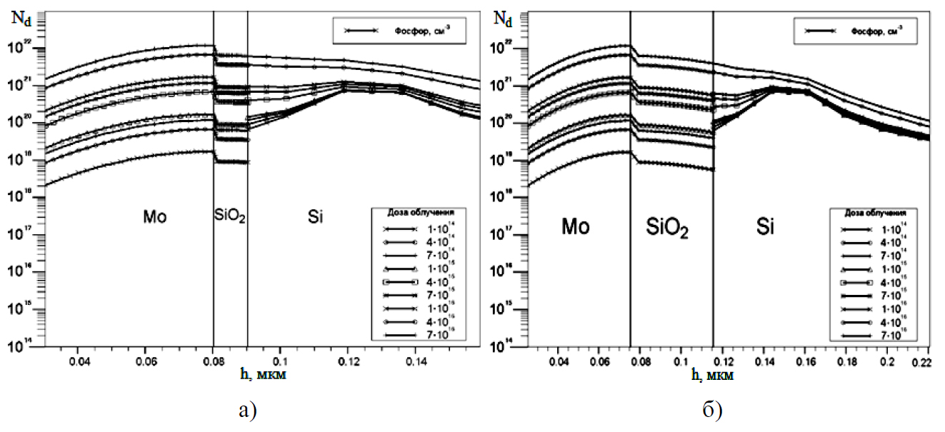 Рисунок 11 – Распределение фосфора по глубине h транзисторной структуры прибора КТ916А после облучения омических контактов Mo – n+Si ионами фосфора с энергией 100 кэВ и дозой в диапазоне 1×1014-7×1016 см-2 для толщины SiO2 0,01мкм (а) и 0,04 мкм (б) (предложенная технология)