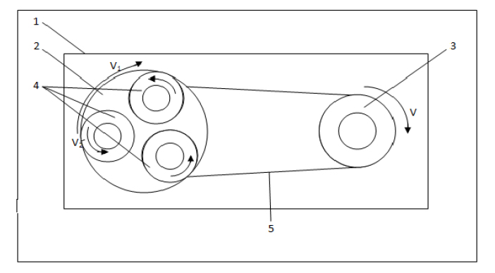 Рисунок 2 – Планетарная мельница АГО-2: 1 – корпус, 2 – водило, 3 – вал, 4 – контейнеры, 5 – ремень