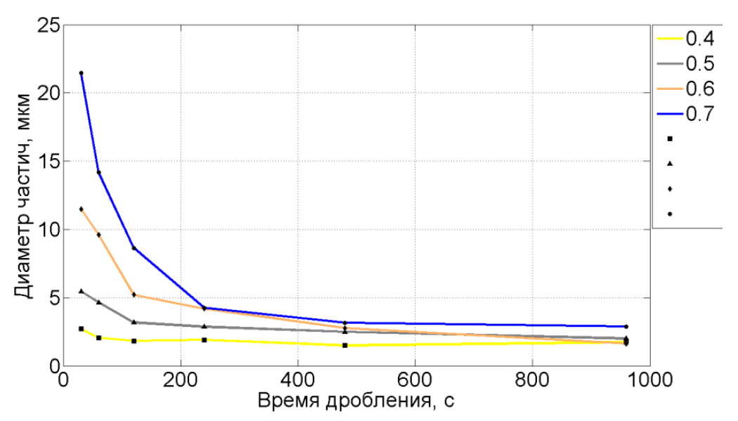 Рисунок 3 – График зависимости диаметра частиц от времени дробления при разных режимах механоактивации