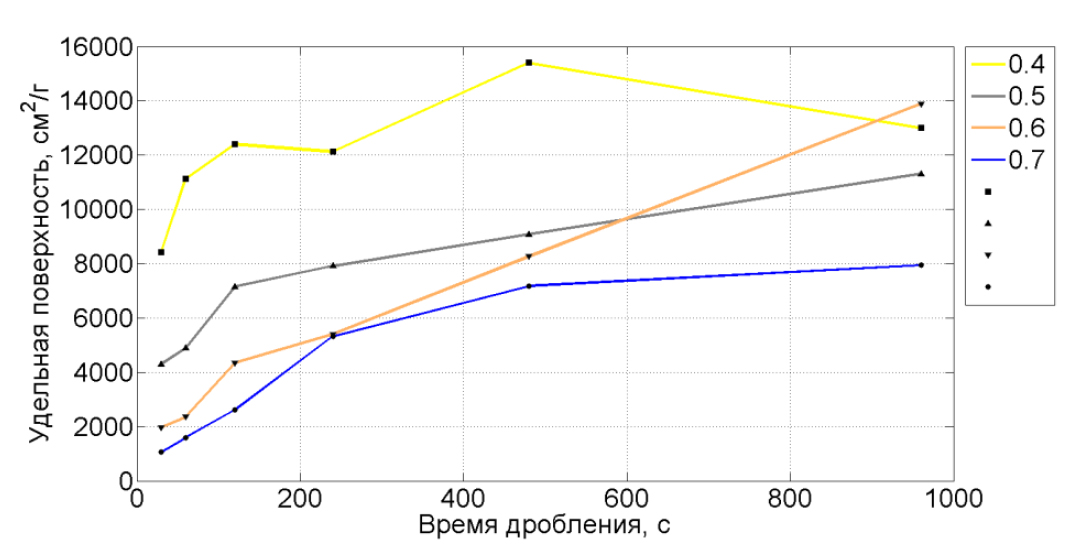 Эксперименты по определению агломерационного предела при механоактивации порошка кварца на планетарной мельнице АГО-2 показали, что в условиях заполнения барабанов в 2/3 объема, а именно при коэффициенте заполнения φ = 0,4 пороговое значение диаметра частиц равно 1,5 мкм, а максимальное значение удельной площади поверхности, которого смогли достичь – 15000 см2/г. Как можно видеть по полученным данным, за первую минуту дробления в таком режиме можно получить ультрадисперсный порошок с высокой удельной поверхностью.