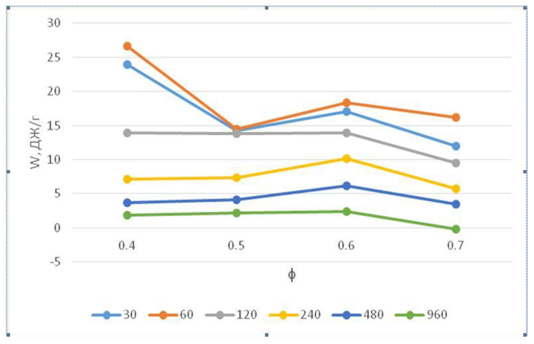 Расчет энергонапряженности и определение агломерационного предела измельчения кварцевого порошка осуществлялся для коэффициента заполнения контейнера φ = 0,4; 0,5; 0,6; 0,7.