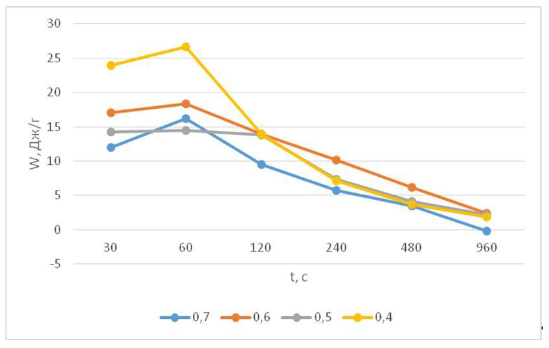 По описанной выше методике был проведен расчет энергонапряженности планетарной мельницы при измельчении кварцевого порошка на разных режимах. В таблице 2 представлены данные по температуре смеси мелющих тел и порошка в начале и в конце процесса дробления, а также расчетные значения энергонапряженности в зависимости от коэффициента заполнения контейнера и времени механоактивации.