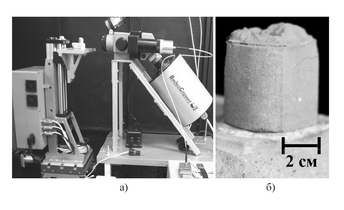 Рисунок 1 – Экспериментальный комплекс (а) и продукт горения с пятном прицельного осветителя (б)