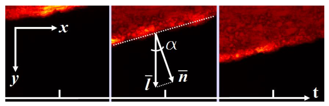 - С учетом эргодичности процесса можно утверждать, что угол между направлением столбцов фотоматрицы и нормалью к фронту волны горения (рис. 2) равен углу , изображенному рисунке 4. Если при регистрации процесса СВС камера сориентирована неправильно, то фронт горения появится в одном из углов тепловизионного изображения раньше, чем в другом. При постоянной скорости распространения фронта величина временной задержки будет линейным образом зависеть от расстояния между сечениями по оси X. Таким образом, направление нормали к фронту волны горения можно определять по средней временной задержке возникновения очагов в разных сечениях изображений тепловизионной съемки даже в случае больших увеличений оптической системы.
