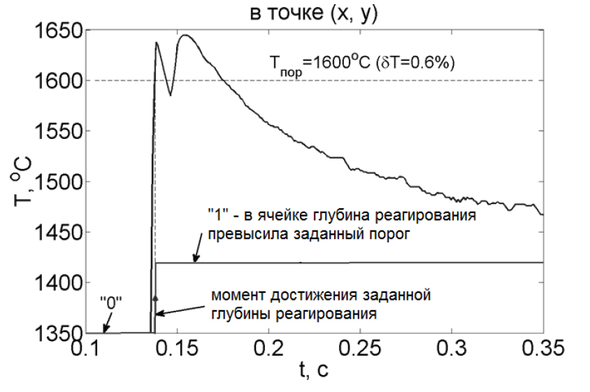 Стационарность процесса СВС в режиме волнового горения позволяет выбрать температурный порог для идентификации фронта реакции достаточно произвольно, потому что его значение будет влиять на абсолютное положение ячеек с заданной глубиной реагирования, но не на среднюю скорость их перемещения по дискретной среде.