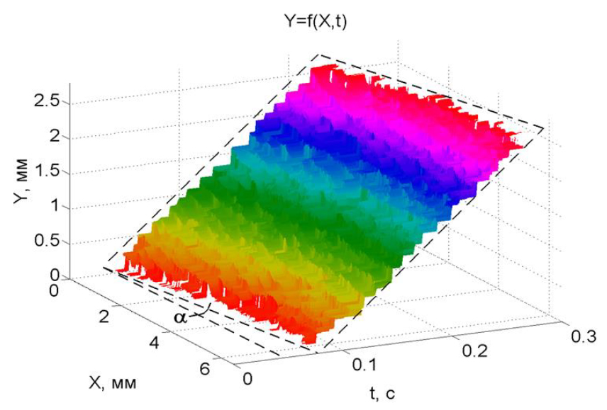 Хронографическая карта на рисунке 4 получена по тепловизионной съемке высокого разрешения: 5.8 мкм и 1 мс. Сечение этой карты плоскостью с дает ступенчатую зависимость координаты фронта горения от времени, подобную той, что представлена в работе [8]. Такой характер зависимости отражает поведение процесса СВС на микромасштабе. Линейная регрессия этой зависимости позволяет определить параметр макрокинетики процесса – скорость распространения волны горения. Количество таких сечений на хронографической карте равно числу столбцов фотоэлементов матричного датчика. Совместный анализ множества зависимостей, представленных в виде хронографической карты, позволяет выявить следующие свойства: