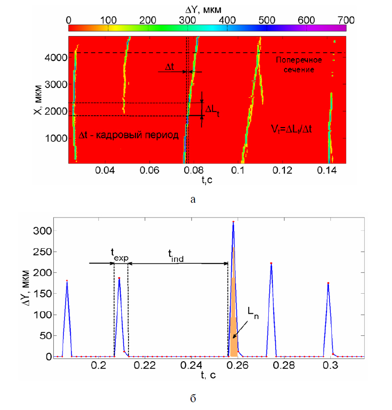 Рисунок 5 – Дифференциальная форма (а) и поперечное сечение (б) хронографической карты процесса СВС (Vt – скорость распространения очага вдоль фронта волны СВС; texp – время существования отдельного очага; tind – время индукции в измерительном сечении нового очага; Ln – размер очага в направлении нормали к фронту горения)