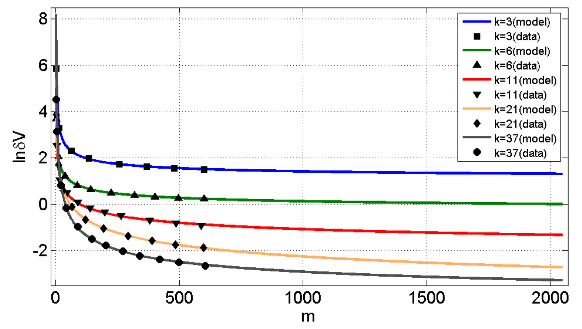 Для оценки погрешности разрабатываемого метода хроно-топографического анализа (ХТА) тепловизионных данных произведен следующий эксперимент. Выполнена тепловизионная съемка высокотемпературного синтеза Ni + Al + NiAl (15 % мас.) при разрешении 5.8 мкм и 2 мс с размером области визирования 7.42 х 5.94 мм (размер цифрового изображения 1280(X) х 1024(Y)). Отклонение нормали к фронту волны СВС от направления столбцов тепловизионного изображения (ось Y), оцененное методом ХТА, составило всего 0.06 градуса. Затем на компьютере случайным образом осуществлялось кадрирование ряда изображений тепловизионной съемки. Усечением изображений по координате X имитировалось сокращение измерительных сечений m, а усечением по координате Y имитировалось изменение увеличения оптической системы (при уменьшении размера кадра по Y растет средний относительный размер очага в измерительном сечении). Для каждого ряда усеченных тепловизионных изображений строилась хронографическая карта процесса СВС, численным методом выполнялся подбор коэффициентов модели (1) и определялись границы доверительных интервалов при уровне значимости 0.05. Величина k определялась с помощью усреднения количества очагов по всем линейным сечениям на топографической карте. В завершении каждого опыта, выполняемого при фиксированных m и k, по формулам (5, 7) рассчитывалась оценка относительной погрешности измерения скорости фронта горения (в процентах). Результаты опытов представлены метками различной формы на рисунке 7.