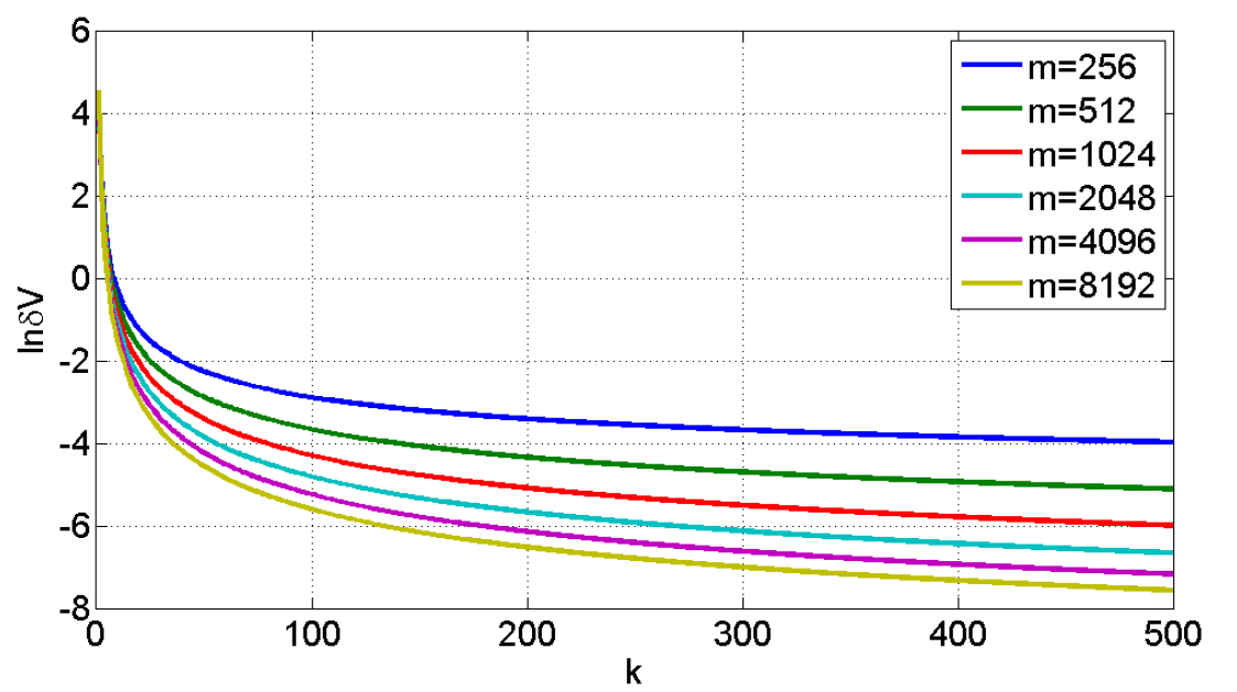 Например, для регистрации процесса применяется тепловизионная камера с размерностью фотоматрицы 256 × 256, а пространственное разрешение съемки составляет 25 мкм. Тогда размер визируемой области объекта составит 6.4 × 6.4 мм. Пусть направление нормали к фронту волны СВС совпадает с направлением столбцов фотоматрицы камеры, а средний размер очага горения в измерительном сечении – 173 мкм. Следовательно, , а . По графику на рисунке 7 определяем или . Если увеличение оптической системы тепловизионной камеры повысить в 6 раз, то пространственное разрешение станет равно 4.2 мкм. Тогда размер визируемой области объекта составит 1075 × 1075 мкм, . Оценка относительно погрешности составит 1.57% (). Если использовать матричный фотодатчик размерности 1280 × 1024, то оценка погрешности для двух рассмотренных случаев, соответственно, составит: 0.008 % (32 × 25.6 мм, ) и 0.088 % (5.38 × 4.3 мм, ). По всем графикам семейства (рис. 7) видно, что уже при 3–5 измерительных сечениях (m) относительная погрешность определения скорости распространения волны СВС превышает уровень 50 %.
