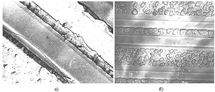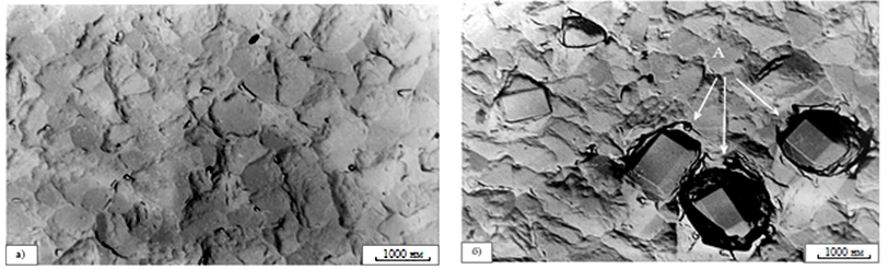 Рисунок 5 – Поверхность эмиттерных (а) и базовых (б) окон n–p–n транзистора после удаления слоя алюминия; ×1200