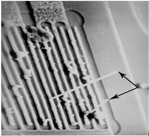 Считается, что рост аномально больших зерен алюминия, размер которых сопоставим с шириной линий эмиттерных алюминиевых токопроводящих дорожек в транзисторах, обусловлен токами высокой частоты в таких линиях [21]. Большой размер зерна возникает в результате вторичной рекристаллизации и вызывает растягивающие напряжения, которые могут привести к отслаиванию или разрушению Al дорожек (рис. 5).