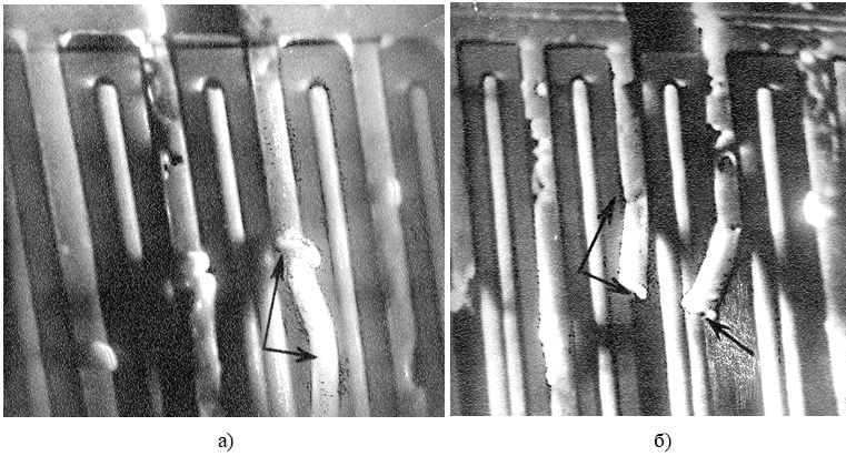 Рисунок 5 – РЭМ-фотография структуры n–p–n транзистора, отказавшего вследствие вторичной рекристаллизации; x2000. Cтрелками показано отслаивание (а) и разрушение (б) Al эмиттерных токоведущих дорожек