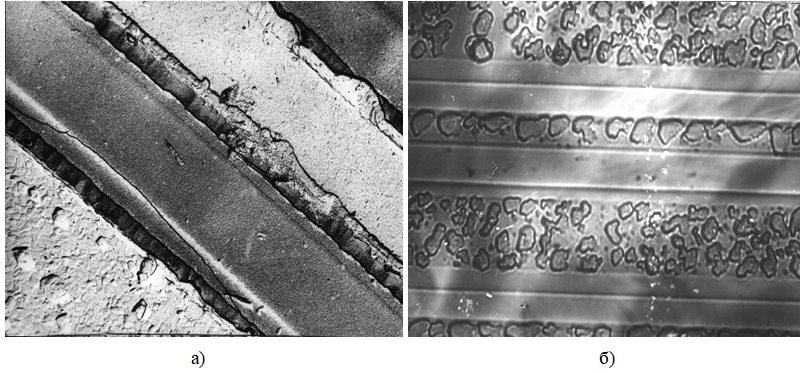 После удаления Al травителем на основе ортофосфорной кислоты, не взаимодействующей с кремнием, титаном и их соединениями, оптические исследования контактных окон к базе и эмиттеру (рис. 7) выявили множество ориентированных частиц Al3Ti [25] на поверхности базовых окон по длине. В то же время на поверхности эмиттерных окон частицы Al3Ti не имели преимущественной ориентации. Эти данные согласуются с приведенными выше результатами по текстуре Al слоев на p+-областях кремния Al/Ti/Si структур.