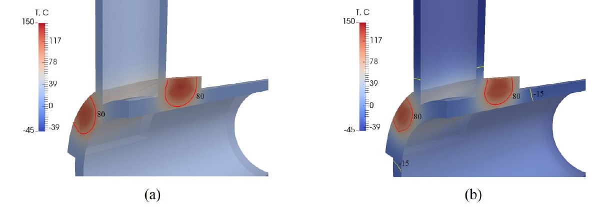 Расчеты динамики температурных полей после оплавления показали, что ЗТВ достигает максимального объема на третьей минуте охлаждения. Охлаждение ЗТВ соединения под слоем теплоизоляции с расчетной толщиной при низкой температуре ОВ протекает по закономерности, характерной при допустимой температуре на открытом воздухе. На рисунке 3 показано сравнение температур в зоне термического влияния, ограниченной изотермой 80°С, при приварке седлового отвода к полиэтиленовой трубе при допустимой температуре воздуха 10°С по стандартной технологии и температуре ниже нормативного – 45°С по предлагаемой технологии в момент времени охлаждения 3 минуты. В обоих случаях на восьмой минуте охлаждения температуры опускаются ниже 80°С, что свидетельствует о завершении процесса кристаллизации.