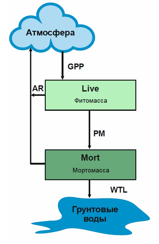 В работе [12] описываются свойства класса математических моделей экологических систем, строящихся по известным в математической экологии диаграммам «запасы–потоки». Алгоритм конструирования таких динамических моделей был предложен Моисеевым и Свирежевым [13]. Выясняются условия диссипативности систем обыкновенных дифференциальных уравнений, инвариантности конуса неотрицательных векторов фазового пространства и формы матрицы Якоби для равновесия. Приводятся примеры вычислительных экспериментов с моделями конкретной болотной экосистемы. На рисунке 3 представлена схема экологической модели, где все запасы измерены в г/м2, а потоки в г/(м2⋅год) сухого веса, т.е. в массовых, а не углеродных единицах.