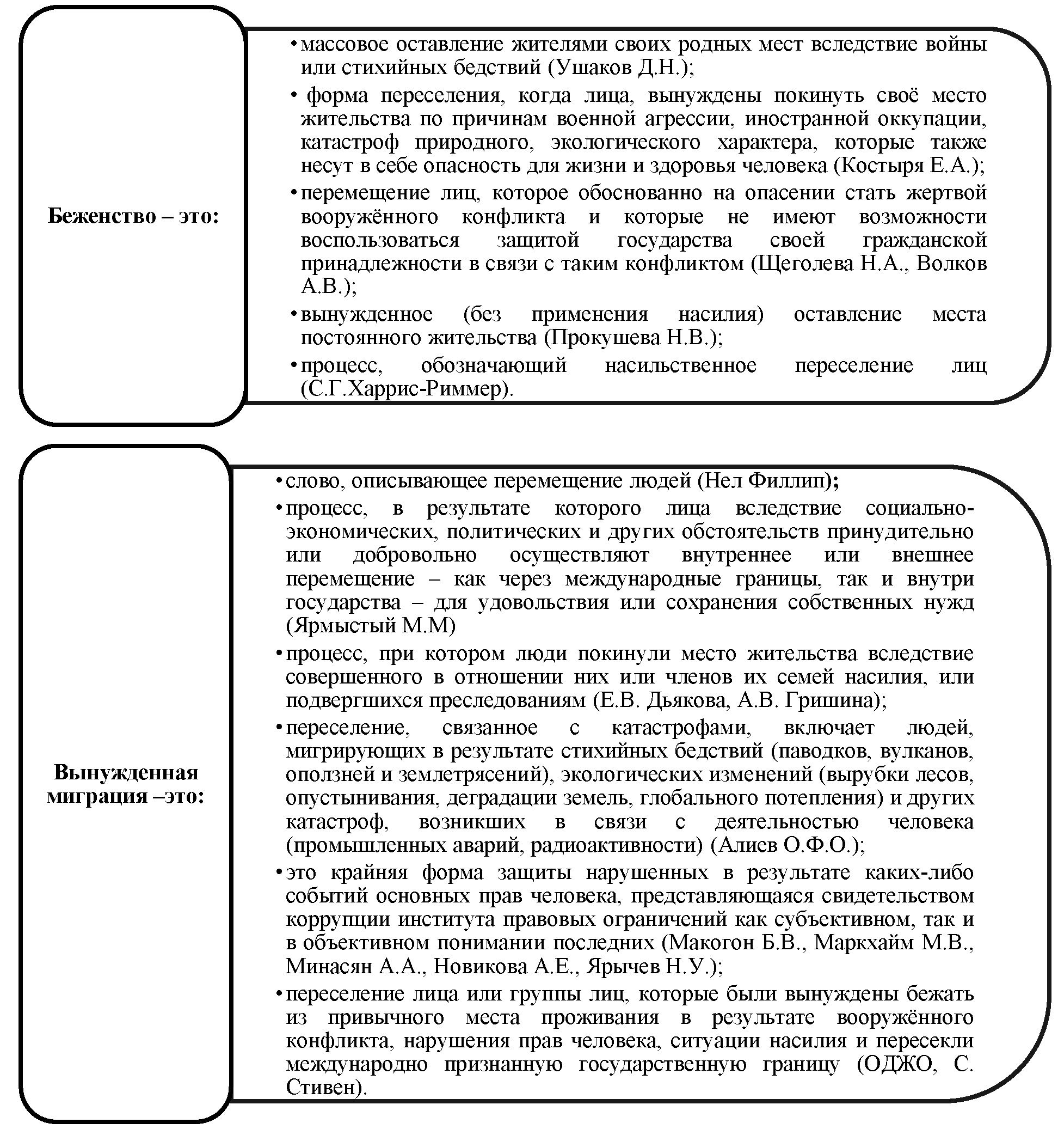 На рисунке 3 представлено обобщение понятий «вынужденная миграция» и «беженство» сформулированные как российскими, так и зарубежными авторами.