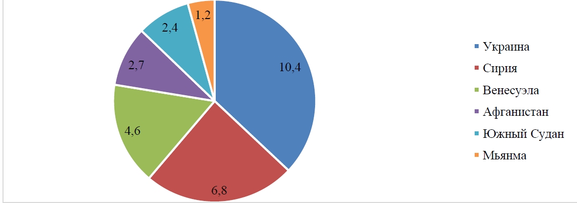 В начале 2022 г. результате преследований, военных конфликтов, насилия, нарушений прав человека или других событий, были вынуждены покинуть свои дома более 100 млн чел. во всём мире. На рисунке 5 представлены данные ООН о численности беженцев и просителей убежища из стран, на которые сегодня приходится наибольшее число вынужденных мигрантов в мире.