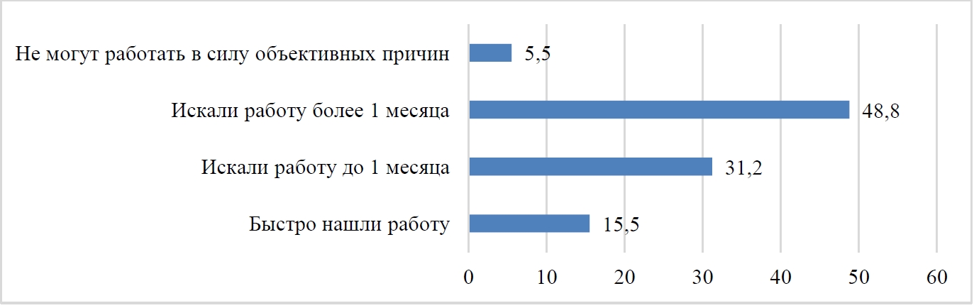 Рисунок 7 – Время, затраченное на поиск работы вынужденными мигрантами в Тюменской обл., % (Источник: согласно проведённого автором исследования)