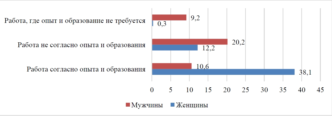 20,2% опрошенных мужчин указали, что они не смогли найти работу согласно опыту и образованию. Поэтому вынуждены были пройти обучение; 9,2 % мужчин трудоустроены на рабочие места, не требующие образования и опыта (грузчик, дворник, курьер, торговый представитель, оператор call-центра, водитель, официант и др.)