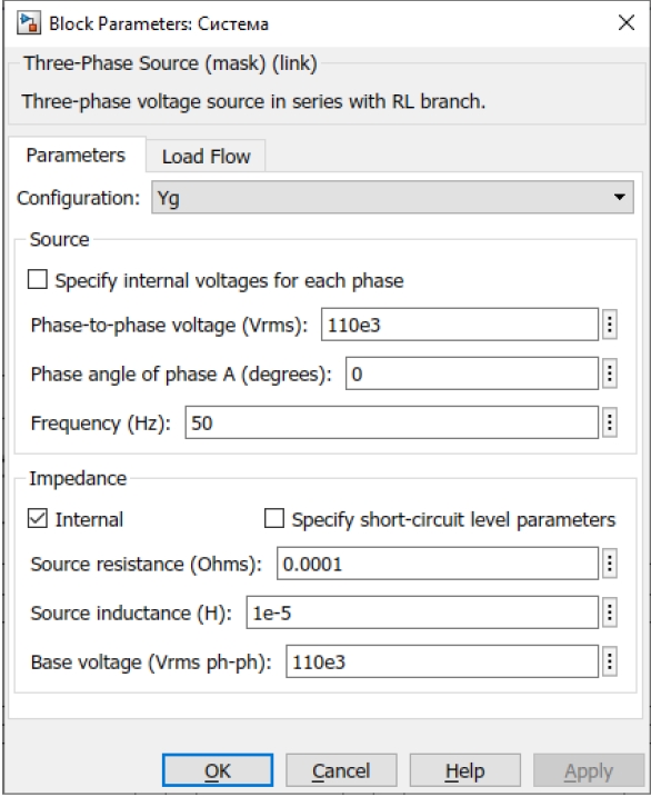 Первый используемый блок – Three Phase Source. Это трехфазный источник питания, который имитирует внешнюю электрическую сеть с номинальным напряжением 110 кВ. Параметры блока представлены на рисунке 3.