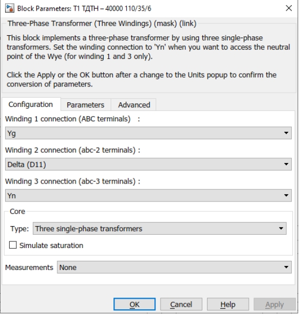 Рисунок 4 – Конфигурация трансформатора 110/35/6 кВ в MATLAB Simulink