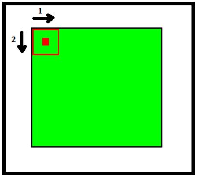 Замечание. На рисунке 2 цифрами 1 и 2 обозначены приоритеты операций сдвига ядра оно сначала сдвигается слева направо до правой границы матрицы и, достигнув ее, сдвигается на 1 элемент сверху вниз (при этом перемещаясь к левой границе матрицы).