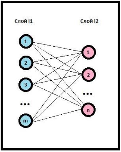 Рассмотрим структуру полносвязного слоя (пусть первый слой нейронов состоит из m нейронов, а второй из n нейронов):
