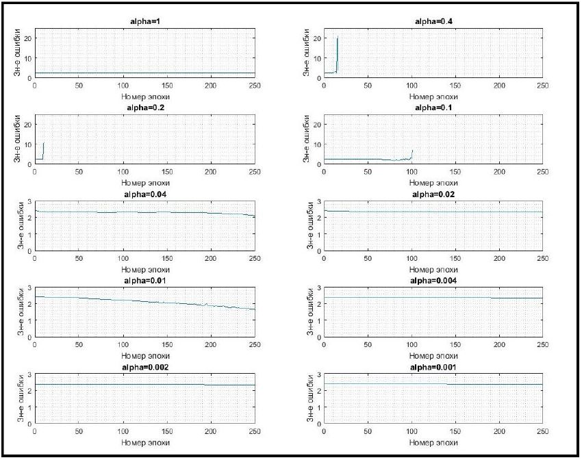 2. Обучение с постоянной скоростью обучения. Для большей сходимости обучения необходимо использовать переменную скорость обучения, зависящую от значения ошибки.